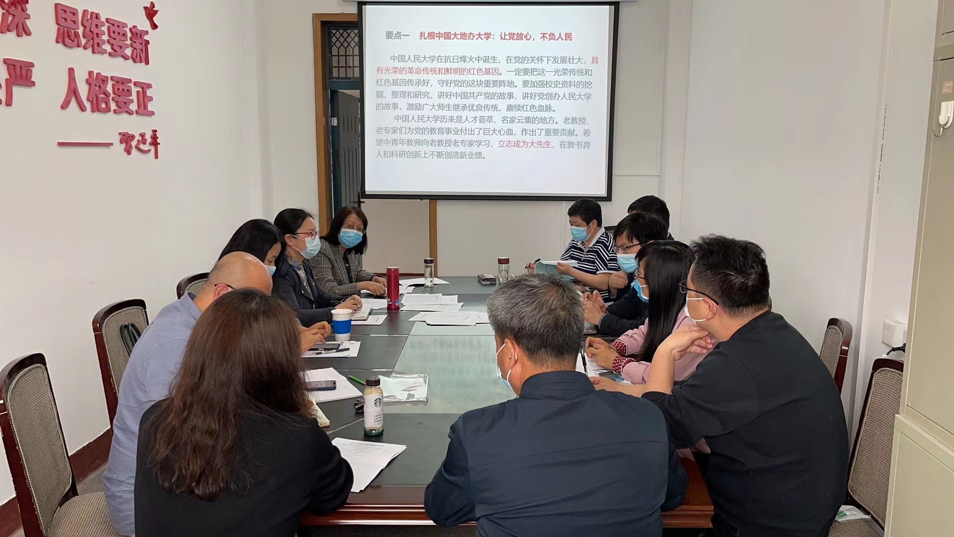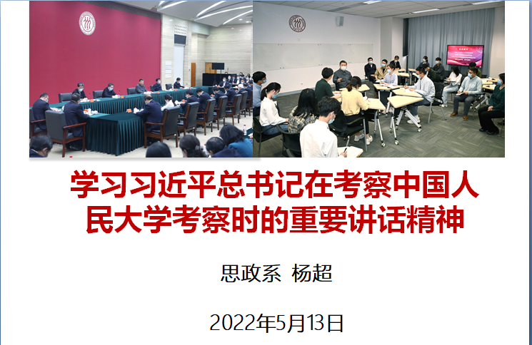 2022年5月13日下午,思政系举行集体备课活动,学习习近平总书记考察中国人民大学时发表的重要讲话精神,此次活动由杨超老师领学,思政系全体教师参加此次学习活动。