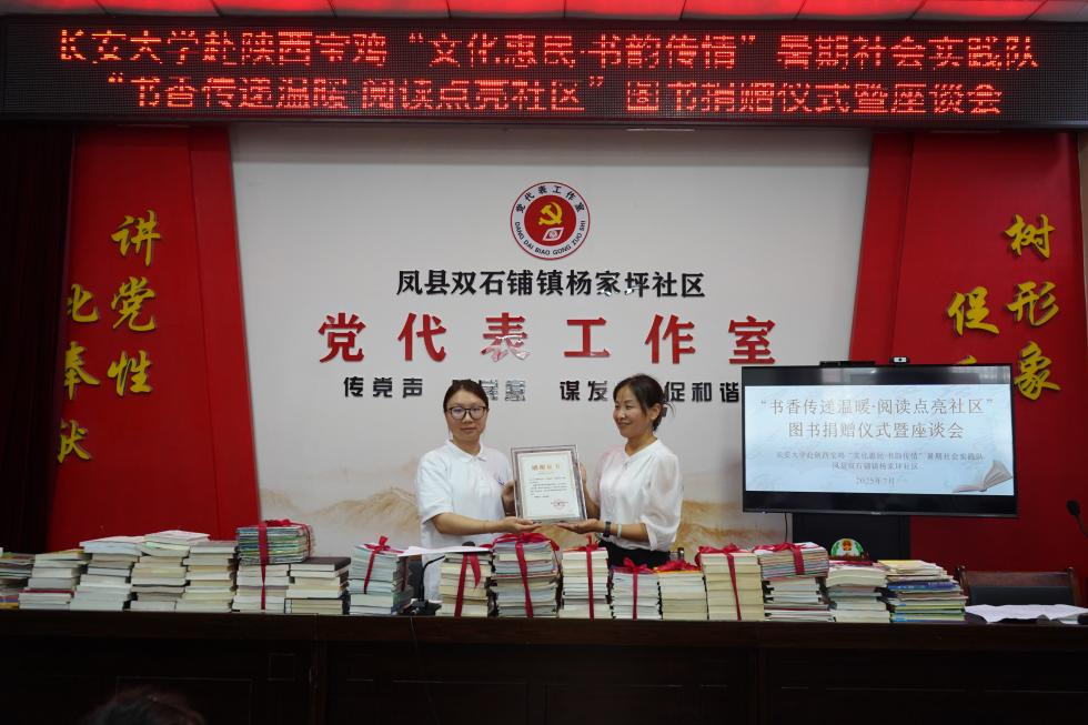 7月16日下午,太阳集团tyc4633赴陕西宝鸡“文化惠民·书韵传情”暑期社会实践队向凤县双石铺镇杨家坪社区捐赠图书400余册,“书香传递温暖·阅读点亮社区”图书捐赠仪式暨座谈会在杨家坪社区党代表工作室内成功举办。此次活动为基层公共文化服务体系注入青春活力。