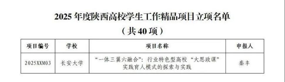 近日,中共陕西省委教育工委公布了2025年度陕西高校学生工作精品项目和研究课题立项名单。我院申报的《“一体三翼六融合”:行业特色型高校“大思政课”实践育人模式的探索与实践》获批学生工作精品项目立项。
