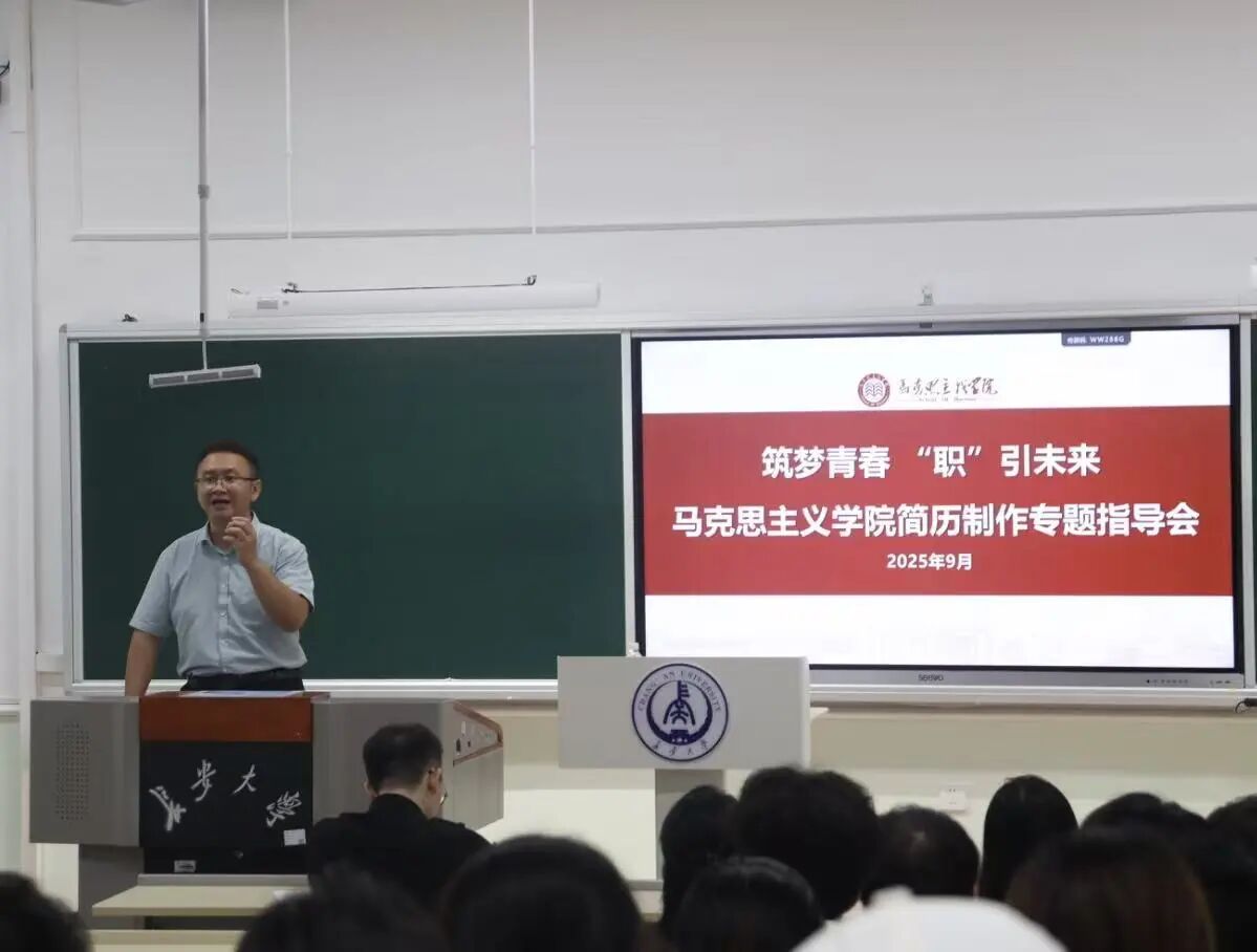 为进一步提升学生职业规划意识和求职核心竞争力,助力2026届毕业生做好求职准备,9月4日,太阳成集团tyc4633在南校区B301教室举办“筑梦青春,‘职’引未来”简历制作及面试技巧专题指导会。本次讲座特邀太阳集团tyc4633招生就业处就业指导教研室主任赵裕民作专题指导。院党委副书记冯迪,学办副主任兼团委书记秦丰,辅导员张子婧及学院2026届全体毕业生、其他年级部分学生参加此次活动。