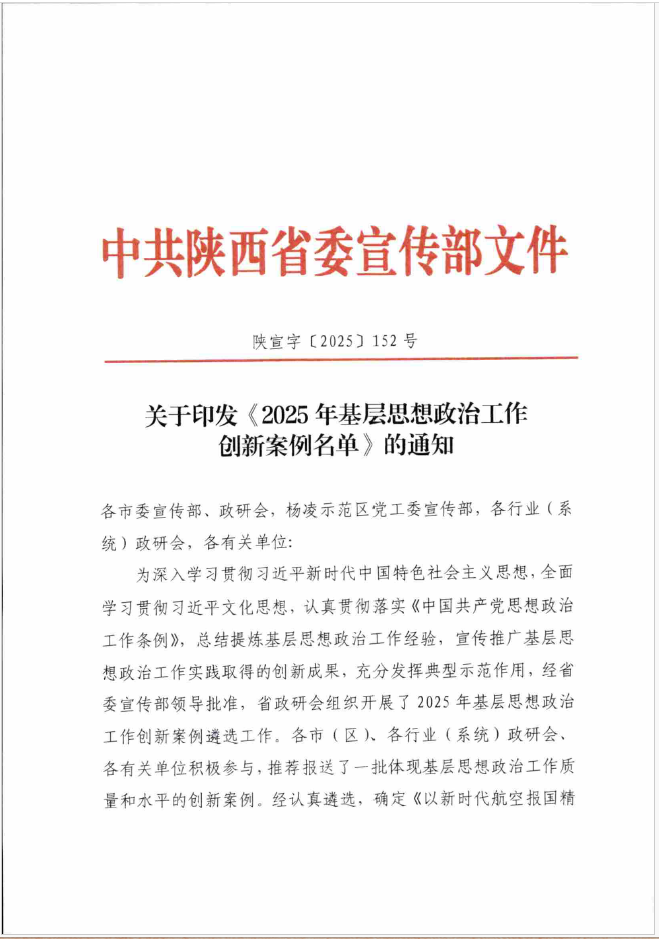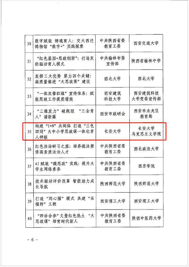 近日,中共陕西省委宣传部、陕西省思想政治工作研究会公布了2025年陕西省基层思想政治工作创新案例评选结果。经单位申报、专家评审、综合评议等环节,我院申报的《构建“1+N”共同体 打造“三色四同”大中小学思政课一体化育人样板》案例成功入选省级创新案例名单。这是我院思想政治工作改革创新取得的又一项重要成果!