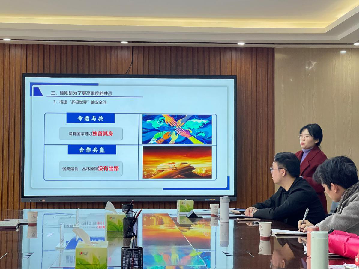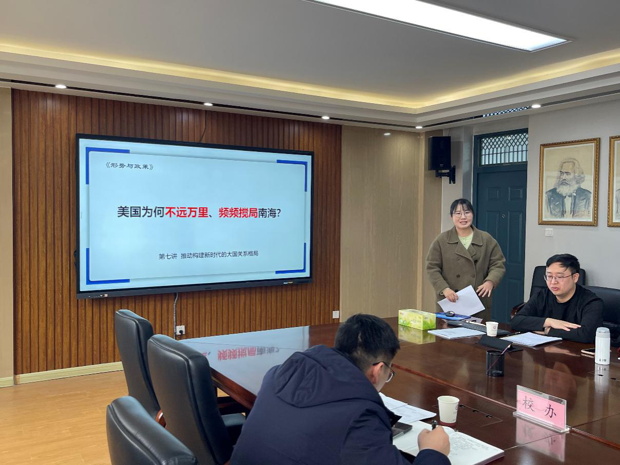 备课会上,教研部主任王振宇介绍了形势与政策教研部总体情况和集体备课开展情况。陈丽蓉老师、赵媛春老师分别围绕“探寻新时期中美正确相处之道”“推动构建新时代大国关系格局”主题进行授课,从不同角度阐释了中美战略博弈的长期性、复杂性和尖锐性。与会教师就授课内容进行了交流研讨,并围绕党的二十届四中全会精神融入“形势与政策”课程教学方案、课程教学重难点、教学方式方法等方面进行了深入讨论。